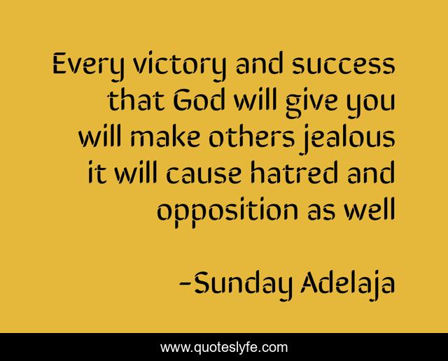 This page presents the quote "Every victory and success that God will give you will make others jealous it will cause hatred and opposition as well". Author of this quote is Sunday Adelaja. This quote is about success, god, victory, opposition, jealous, hatred,.