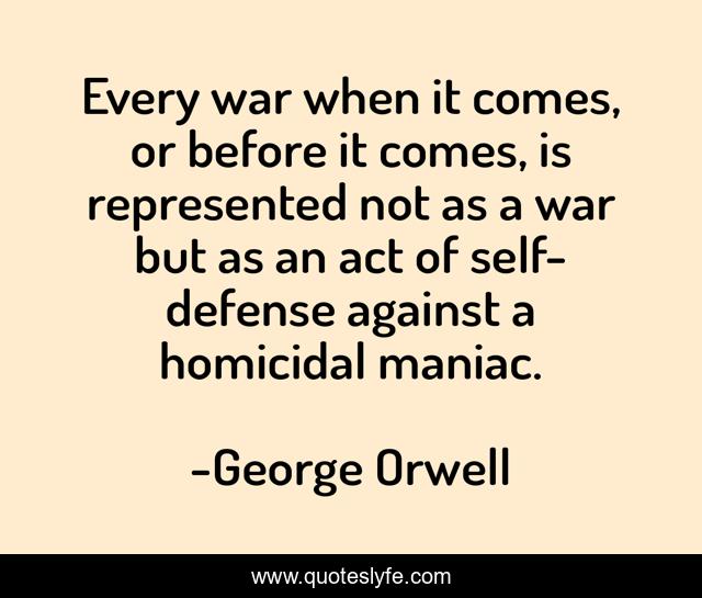 This page presents the quote "Every war when it comes, or before it comes, is represented not as a war but as an act of self-defense against a homicidal maniac.". Author of this quote is George Orwell. This quote is about self-defense, act,.
