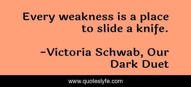 This page presents the quote "Every weakness is a place to slide a knife.". Author of this quote is Victoria Schwab, Our Dark Duet. This quote is about weakness, kate-harker, callum-harker,.