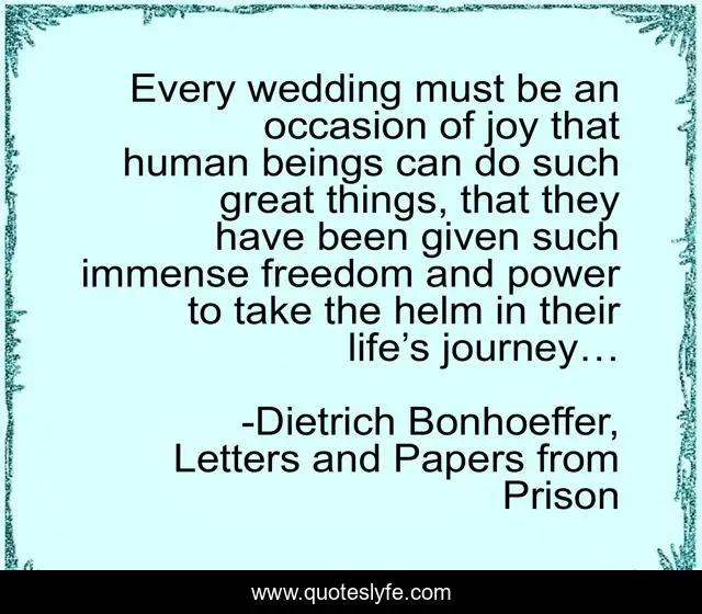 This page presents the quote "Every wedding must be an occasion of joy that human beings can do such great things, that they have been given such immense freedom and power to take the helm in their life’s journey…". Author of this quote is Dietrich Bonhoeffer, Letters and Papers from Prison. This quote is about marriage, christianity,.