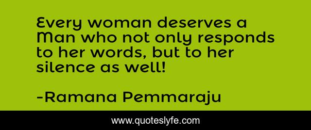 This page presents the quote "Every woman deserves a Man who not only responds to her words, but to her silence as well!". Author of this quote is Ramana Pemmaraju. This quote is about woman, communion, soul-connection, man, communion-with-god,.
