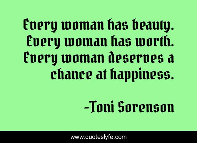 This page presents the quote "Every woman has beauty. Every woman has worth. Every woman deserves a chance at happiness.". Author of this quote is Toni Sorenson. This quote is about love, happiness, affection, women,.