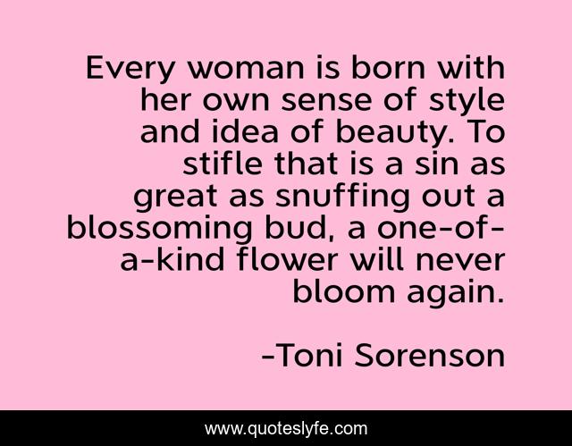 This page presents the quote "Every woman is born with her own sense of style and idea of beauty. To stifle that is a sin as great as snuffing out a blossoming bud, a one-of-a-kind flower will never bloom again.". Author of this quote is Toni Sorenson. This quote is about life, beauty, women,.