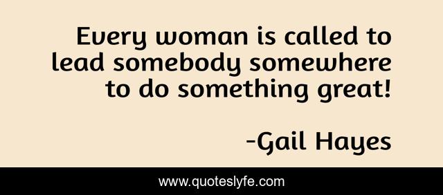 This page presents the quote "Every woman is called to lead somebody somewhere to do something great!". Author of this quote is Gail Hayes. This quote is about leadership, destiny, life-lessons, greatness,.