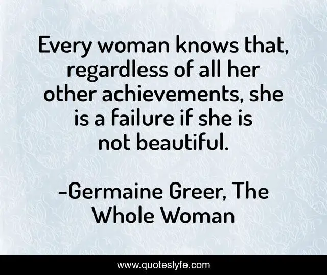 This page presents the quote "Every woman knows that, regardless of all her other achievements, she is a failure if she is not beautiful.". Author of this quote is Germaine Greer, The Whole Woman. This quote is about society, body-image, beauty, weight, self-esteem,.