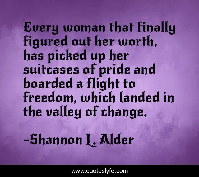 This page presents the quote "Every woman that finally figured out her worth, has picked up her suitcases of pride and boarded a flight to freedom, which landed in the valley of change.". Author of this quote is Shannon L. Alder. This quote is about self-respect, challenges, relationships, confidence, inspiration, letting-go, divorce, acceptance, boundaries,.