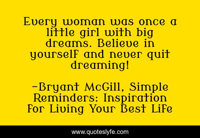 This page presents the quote "Every woman was once a little girl with big dreams. Believe in yourself and never quit dreaming!". Author of this quote is Bryant McGill, Simple Reminders: Inspiration for Living Your Best Life. This quote is about little, woman, dreams,.
