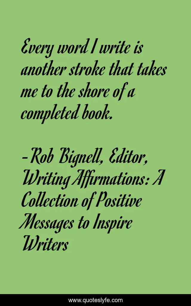 This page presents the quote "Every word I write is another stroke that takes me to the shore of a completed book.". Author of this quote is Rob Bignell, Editor, Writing Affirmations: A Collection of Positive Messages to Inspire Writers. This quote is about writers-inspiration, writing-process, writing-craft, writing-advice, writer, writing-inspiration, writing, writers, writers-block,.
