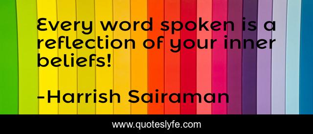 This page presents the quote "Every word spoken is a reflection of your inner beliefs!". Author of this quote is Harrish Sairaman. This quote is about inner-belief, word, reflection,.