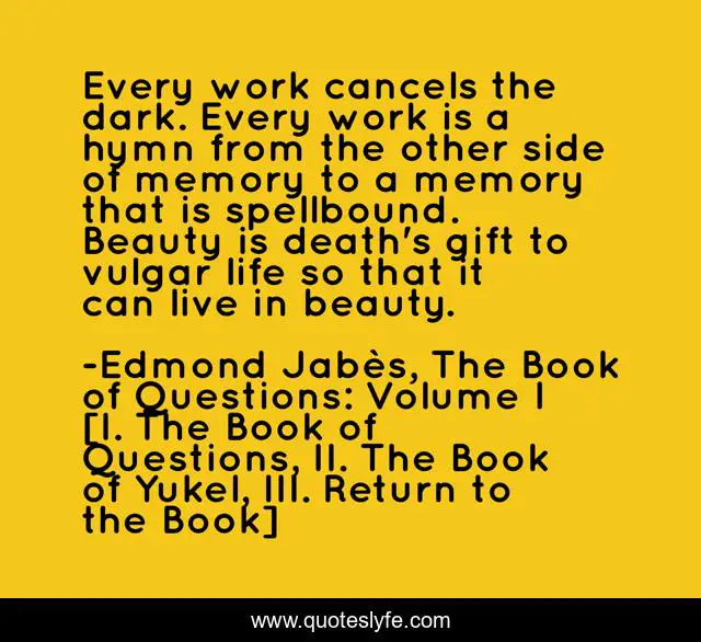 This page presents the quote "Every work cancels the dark. Every work is a hymn from the other side of memory to a memory that is spellbound. Beauty is death's gift to vulgar life so that it can live in beauty.". Author of this quote is Edmond Jabès, The Book of Questions: Volume I [I. The Book of Questions, II. The Book of Yukel, III. Return to the Book]. This quote is about memory, death, books, beauty, writing,.