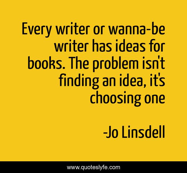 This page presents the quote "Every writer or wanna-be writer has ideas for books. The problem isn't finding an idea, it's choosing one". Author of this quote is Jo Linsdell. This quote is about writers-on-writing, writers, writing-books, ideas, writing-process,.