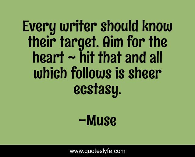 This page presents the quote "Every writer should know their target. Aim for the heart ~ hit that and all which follows is sheer ecstasy.". Author of this quote is Muse. This quote is about poets, word-craft, writing-tips, be-a-better-writer, writer, how-to-write, craft-of-writing, why-i-write, goals,.