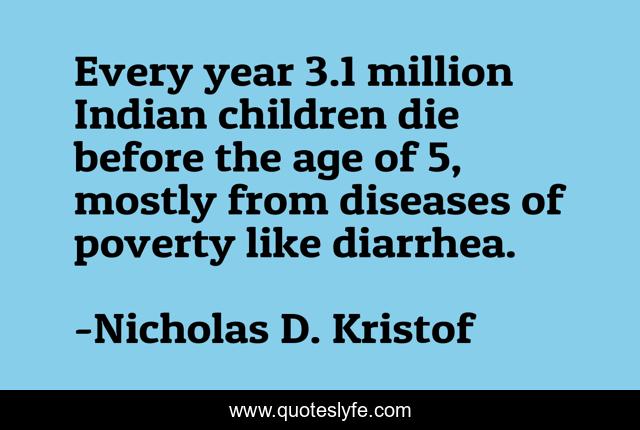 This page presents the quote "Every year 3.1 million Indian children die before the age of 5, mostly from diseases of poverty like diarrhea.". Author of this quote is Nicholas D. Kristof. This quote is about die, poverty, children,.