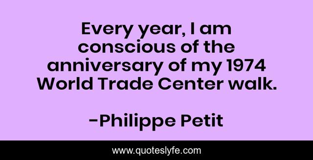 This page presents the quote "Every year, I am conscious of the anniversary of my 1974 World Trade Center walk.". Author of this quote is Philippe Petit. This quote is about world, walk,.