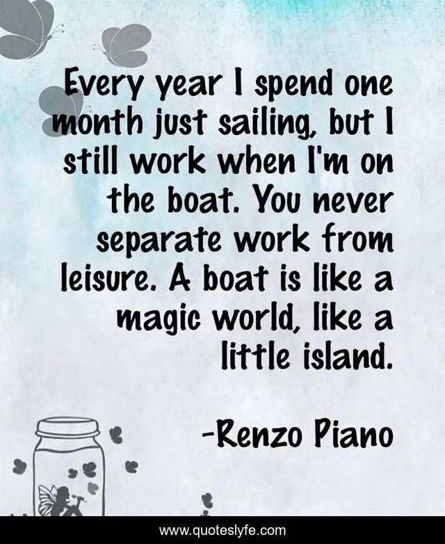 This page presents the quote "Every year I spend one month just sailing, but I still work when I'm on the boat. You never separate work from leisure. A boat is like a magic world, like a little island.". Author of this quote is Renzo Piano. This quote is about world, magic, boat,.