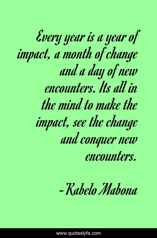 This page presents the quote "Every year is a year of impact, a month of change and a day of new encounters. Its all in the mind to make the impact, see the change and conquer new encounters.". Author of this quote is Kabelo Mabona. This quote is about impact, mind, change, encounter,.