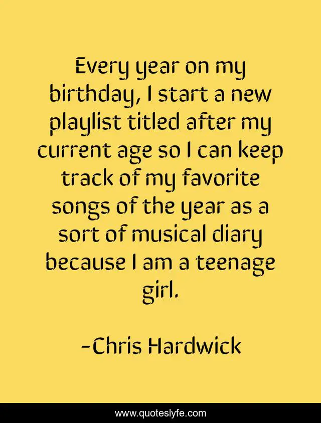 This page presents the quote "Every year on my birthday, I start a new playlist titled after my current age so I can keep track of my favorite songs of the year as a sort of musical diary because I am a teenage girl.". Author of this quote is Chris Hardwick. This quote is about age, girl,.