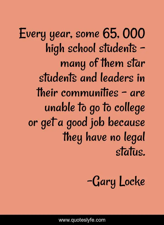 This page presents the quote "Every year, some 65, 000 high school students - many of them star students and leaders in their communities - are unable to go to college or get a good job because they have no legal status.". Author of this quote is Gary Locke. This quote is about school, good, college,.