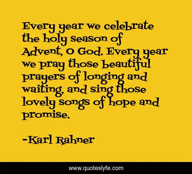 This page presents the quote "Every year we celebrate the holy season of Advent, O God. Every year we pray those beautiful prayers of longing and waiting, and sing those lovely songs of hope and promise.". Author of this quote is Karl Rahner. This quote is about beautiful, god, christmas,.