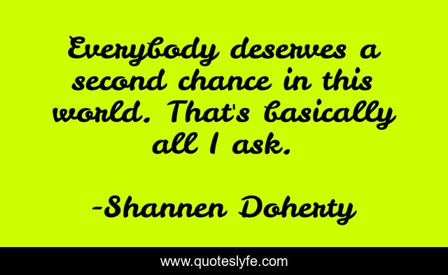 This page presents the quote "Everybody deserves a second chance in this world. That's basically all I ask.". Author of this quote is Shannen Doherty. This quote is about world, second, second chance,.