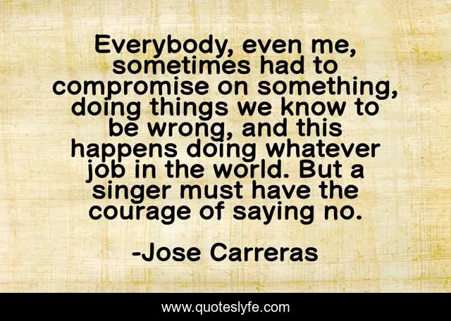 This page presents the quote "Everybody, even me, sometimes had to compromise on something, doing things we know to be wrong, and this happens doing whatever job in the world. But a singer must have the courage of saying no.". Author of this quote is Jose Carreras. This quote is about me, world, job,.