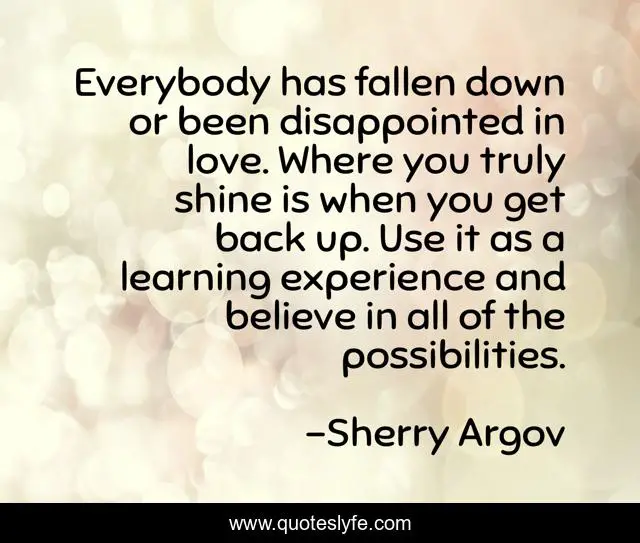 This page presents the quote "Everybody has fallen down or been disappointed in love. Where you truly shine is when you get back up. Use it as a learning experience and believe in all of the possibilities.". Author of this quote is Sherry Argov. This quote is about learning, experience,.