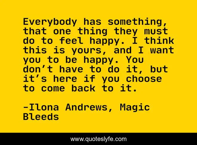 This page presents the quote "Everybody has something, that one thing they must do to feel happy. I think this is yours, and I want you to be happy. You don’t have to do it, but it’s here if you choose to come back to it.". Author of this quote is Ilona Andrews, Magic Bleeds. This quote is about work, job, fulfillment, happy, happiness, something,.