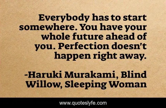 This page presents the quote "Everybody has to start somewhere. You have your whole future ahead of you. Perfection doesn't happen right away.". Author of this quote is Haruki Murakami, Blind Willow, Sleeping Woman. This quote is about life, work, experience, future, perfection, starting,.
