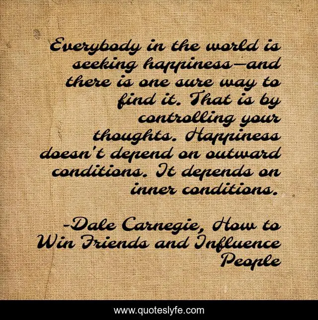 This page presents the quote "Everybody in the world is seeking happiness—and there is one sure way to find it. That is by controlling your thoughts. Happiness doesn't depend on outward conditions. It depends on inner conditions.". Author of this quote is Dale Carnegie, How to Win Friends and Influence People. This quote is about happiness, life-lessons, self-control,.