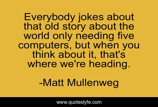 This page presents the quote "Everybody jokes about that old story about the world only needing five computers, but when you think about it, that's where we're heading.". Author of this quote is Matt Mullenweg. This quote is about world, story, think,.