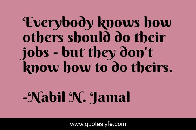 This page presents the quote "Everybody knows how others should do their jobs - but they don't know how to do theirs.". Author of this quote is Nabil N. Jamal. This quote is about everybody, nabil-n-jamal, knows, nabil, their, job, don-t, nabil-jamal, jobs,.