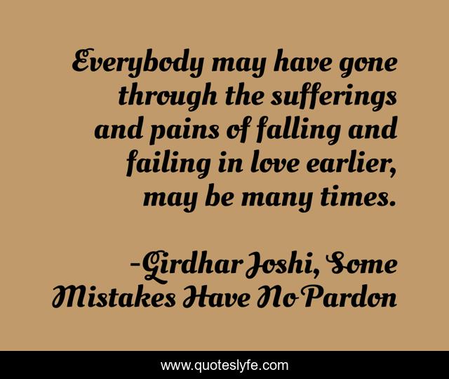 This page presents the quote "Everybody may have gone through the sufferings and pains of falling and failing in love earlier, may be many times.". Author of this quote is Girdhar Joshi, Some Mistakes Have No Pardon. This quote is about love, suffering, pain, affection,.