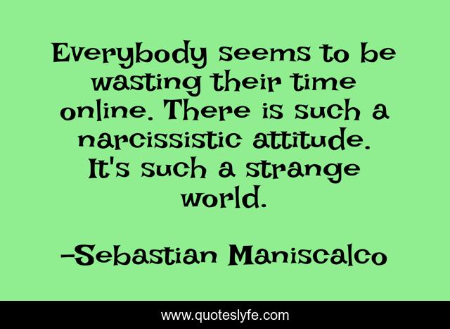 This page presents the quote "Everybody seems to be wasting their time online. There is such a narcissistic attitude. It's such a strange world.". Author of this quote is Sebastian Maniscalco. This quote is about world, strange, time,.