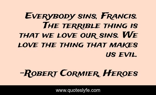 This page presents the quote "Everybody sins, Francis. The terrible thing is that we love our sins. We love the thing that makes us evil.". Author of this quote is Robert Cormier, Heroes. This quote is about love, psychology, evil, humanity, robert-cormier, heroes, sin, affection,.