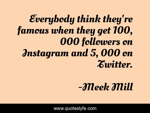 This page presents the quote "Everybody think they're famous when they get 100, 000 followers on Instagram and 5, 000 on Twitter.". Author of this quote is Meek Mill. This quote is about everybody, followers, think,.