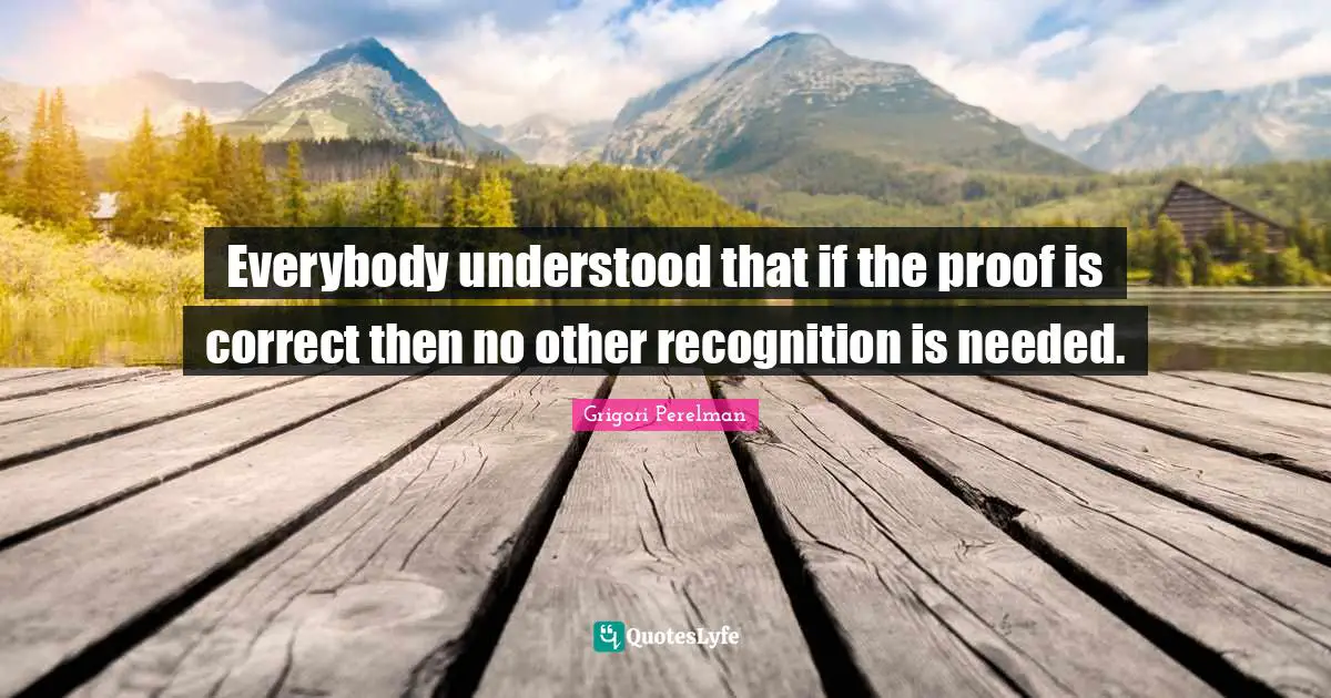 This page presents the quote "Everybody understood that if the proof is correct then no other recognition is needed.". Author of this quote is Grigori Perelman. This quote is about understood, recognition, proof, needed,.