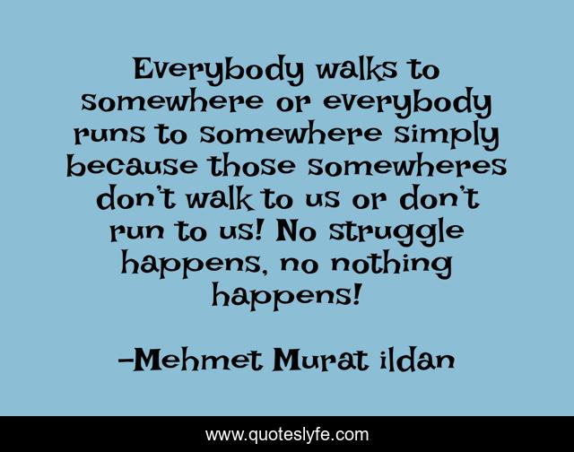 This page presents the quote "Everybody walks to somewhere or everybody runs to somewhere simply because those somewheres don’t walk to us or don’t run to us! No struggle happens, no nothing happens!". Author of this quote is Mehmet Murat ildan. This quote is about everybody, run, somewhere, struggles, walk, struggle, struggles-in-life,.