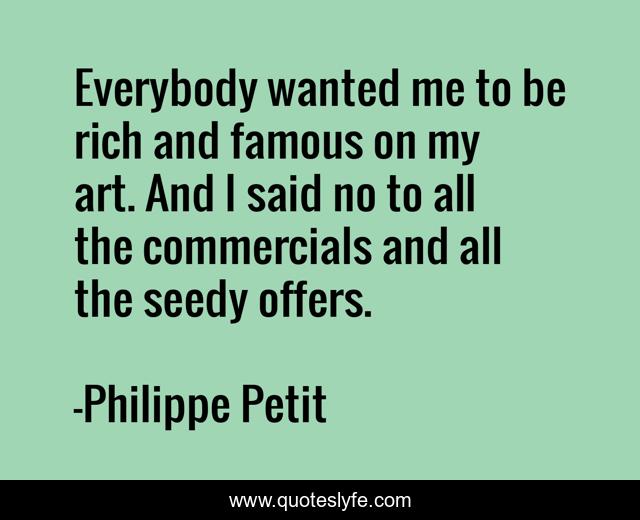This page presents the quote "Everybody wanted me to be rich and famous on my art. And I said no to all the commercials and all the seedy offers.". Author of this quote is Philippe Petit. This quote is about me, art, rich,.