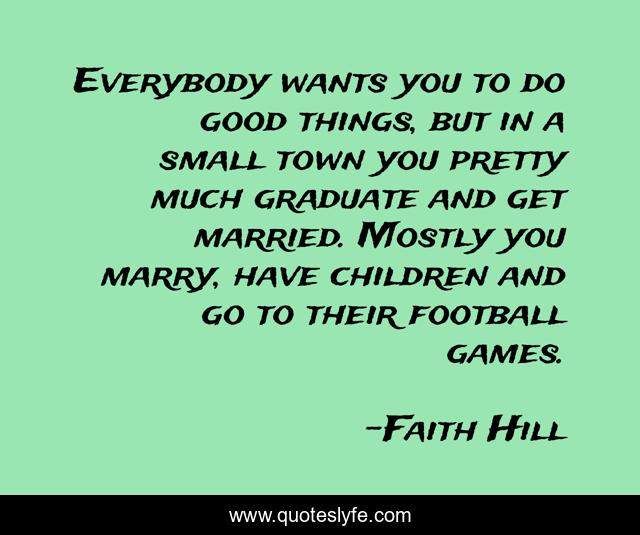 This page presents the quote "Everybody wants you to do good things, but in a small town you pretty much graduate and get married. Mostly you marry, have children and go to their football games.". Author of this quote is Faith Hill. This quote is about good, children, football,.