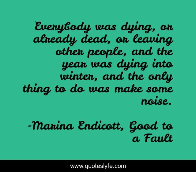 This page presents the quote "Everybody was dying, or already dead, or leaving other people, and the year was dying into winter, and the only thing to do was make some noise.". Author of this quote is Marina Endicott, Good to a Fault. This quote is about death, winter,.