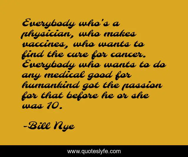 This page presents the quote "Everybody who's a physician, who makes vaccines, who wants to find the cure for cancer. Everybody who wants to do any medical good for humankind got the passion for that before he or she was 10.". Author of this quote is Bill Nye. This quote is about good, passion, cancer,.