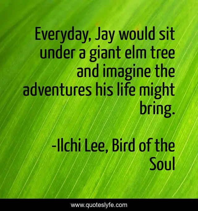 This page presents the quote "Everyday, Jay would sit under a giant elm tree and imagine the adventures his life might bring.". Author of this quote is Ilchi Lee, Bird of the Soul. This quote is about imagination, dream, soul,.