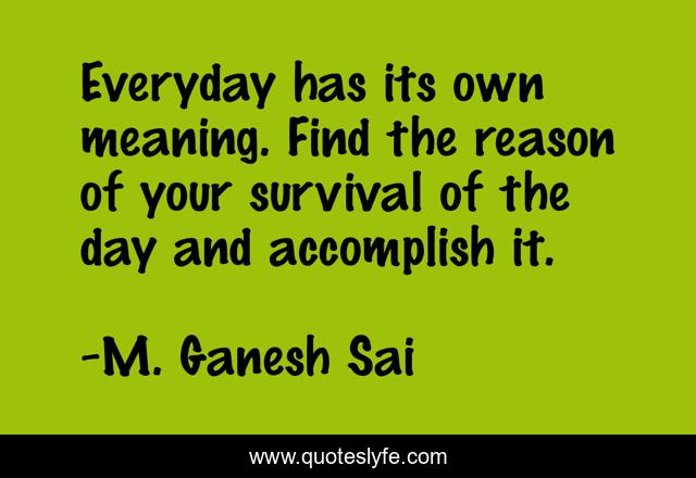 This page presents the quote "Everyday has its own meaning. Find the reason of your survival of the day and accomplish it.". Author of this quote is M. Ganesh Sai. This quote is about reason, meaning, accomplish, survival,.