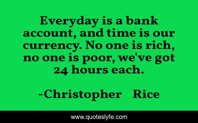 This page presents the quote "Everyday is a bank account, and time is our currency. No one is rich, no one is poor, we've got 24 hours each.". Author of this quote is Christopher Rice. This quote is about banks, money, life, wealth, time,.