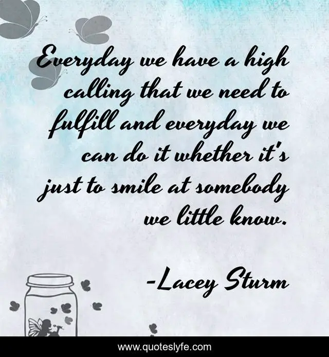 This page presents the quote "Everyday we have a high calling that we need to fulfill and everyday we can do it whether it's just to smile at somebody we little know.". Author of this quote is Lacey Sturm. This quote is about simplicity, flyleaf, encourage, inspirational, enthusiasm, mosley, purpose-of-life,.
