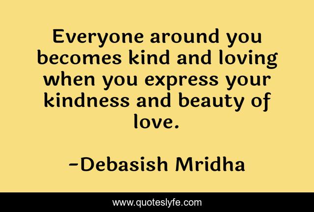 This page presents the quote "Everyone around you becomes kind and loving when you express your kindness and beauty of love.". Author of this quote is Debasish Mridha. This quote is about life, love, knowledge, inspirational, intelligence, philosophy, wisdom, quotes, affection,.