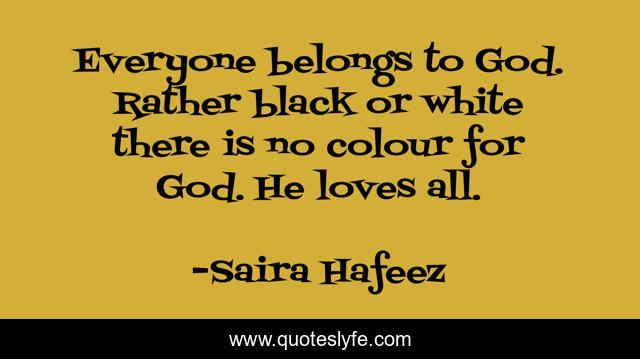 This page presents the quote "Everyone belongs to God. Rather black or white there is no colour for God. He loves all.". Author of this quote is Saira Hafeez. This quote is about god, spiritual, love, affection,.