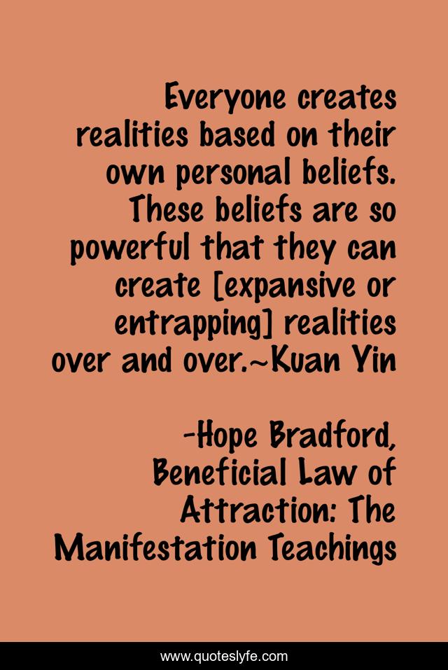 This page presents the quote "Everyone creates realities based on their own personal beliefs. These beliefs are so powerful that they can create [expansive or entrapping] realities over and over.~Kuan Yin". Author of this quote is Hope Bradford, Beneficial Law of Attraction: The Manifestation Teachings. This quote is about gratitude, prosperity, goddess, loa, love, wealth, relationships, law-of-attraction, manifestation,.