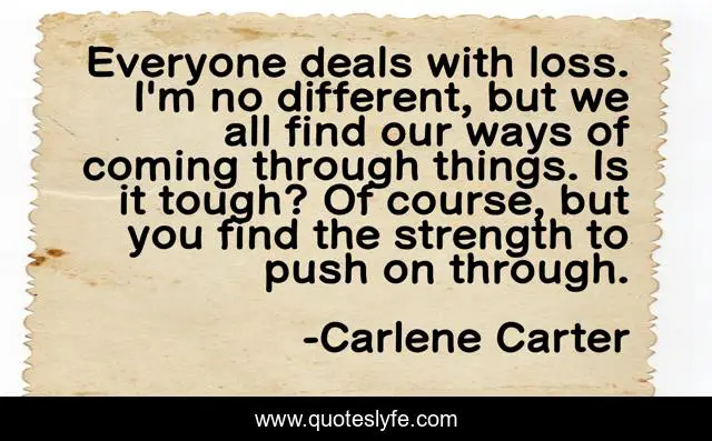 This page presents the quote "Everyone deals with loss. I'm no different, but we all find our ways of coming through things. Is it tough? Of course, but you find the strength to push on through.". Author of this quote is Carlene Carter. This quote is about push, loss,.