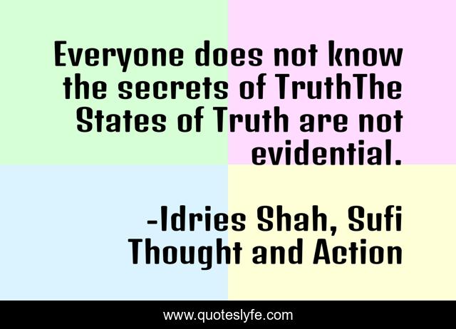 This page presents the quote "Everyone does not know the secrets of TruthThe States of Truth are not evidential.". Author of this quote is Idries Shah, Sufi Thought and Action. This quote is about sufism, sufis, truth,.